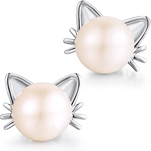 Aretes con diseño de Gato – plata de ley con perlas cultivadas en agua dulce – ZowBinBin