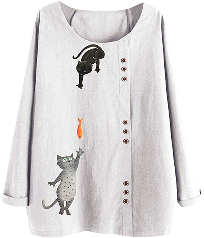 Blusa de algodón y lino con cuello redondo con diseño de gatos